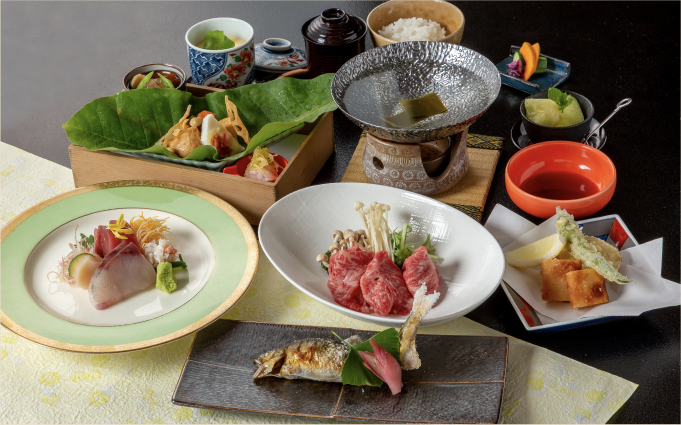 前菜5点盛り、季節のお刺身、油物、焼物、温物、鍋物、酢の物、お食事、水菓子